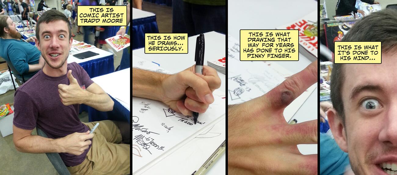 Moore holds his tools with four fingers. His pinky is constantly creating friction with the paper. There's an
